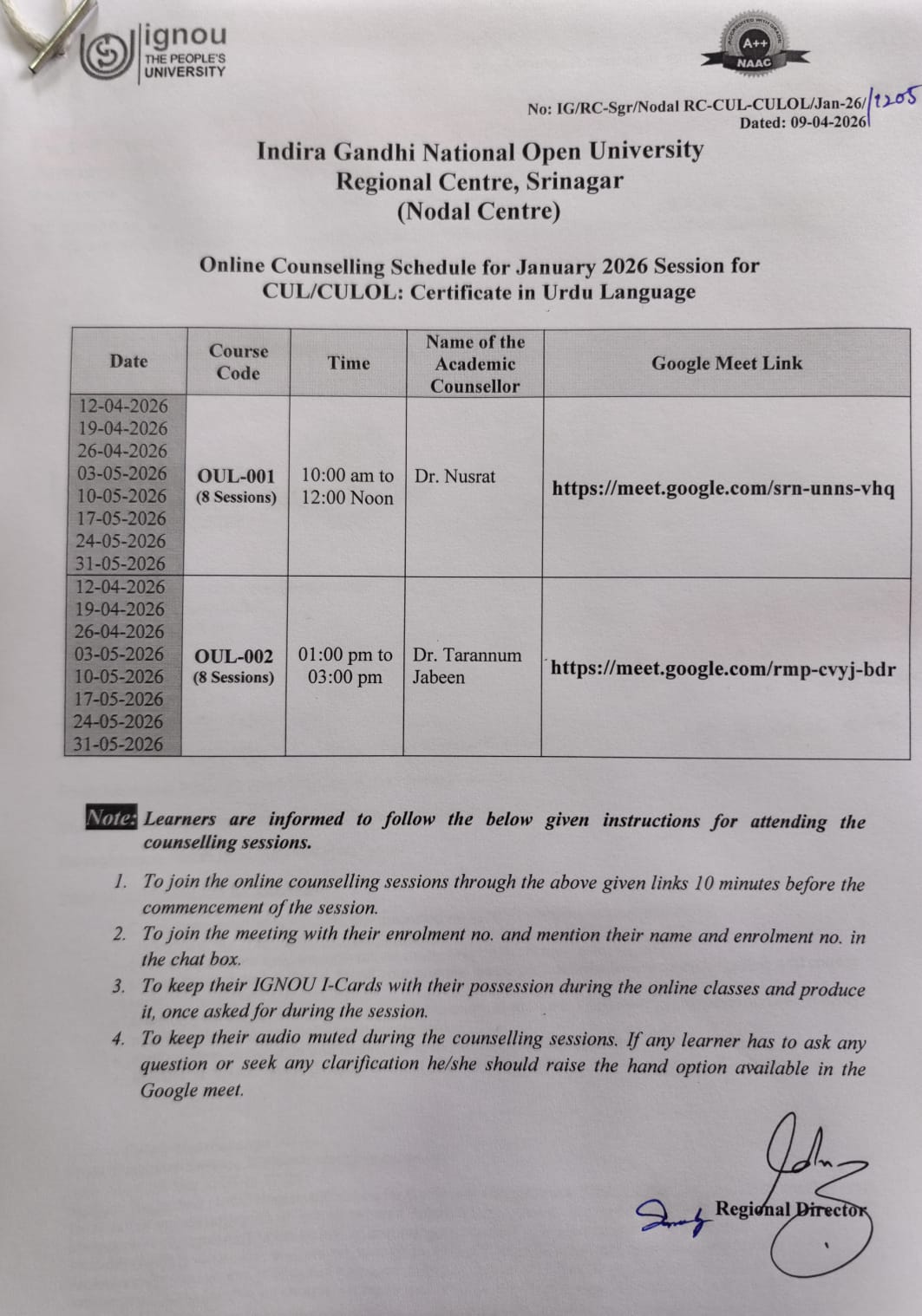 Online Counselling schedule of CUL/CULOL Programme for January 2025 session from Nodal RC Srinagar
